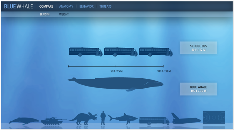 舉個(gè)例子:國(guó)家地理藍(lán)鯨網(wǎng)站 為了呼吁保護(hù)藍(lán)鯨,首先要讓人們了解藍(lán)鯨的特征及當(dāng)前的威脅,網(wǎng)站通過(guò)動(dòng)態(tài)的將藍(lán)鯨與其他生物和人造物進(jìn)行對(duì)比,形象直觀的傳達(dá)藍(lán)鯨的重量、大小,加上視頻展示目前藍(lán)鯨的主要生活威脅,用戶即使不閱讀文字也能大致明白網(wǎng)站想要傳達(dá)的信息