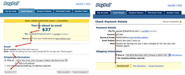 下圖是PayPal支付頁(yè)面的一次優(yōu)化過(guò)程,老版視覺(jué)雖然有層級(jí)區(qū)別,卻打亂了完成任務(wù)的視線順序,優(yōu)化后強(qiáng)調(diào)行動(dòng)點(diǎn),行動(dòng)前的視覺(jué)順序在同一方向上,順序的關(guān)系很明顯,能提升用戶的任務(wù)完成率。