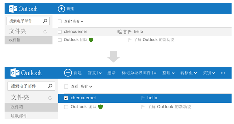 Outlook郵件網(wǎng)頁(yè)界面,默認(rèn)情況下對(duì)郵件的操作入口都是隱藏的,只有當(dāng)用戶選擇了郵件之后,才會(huì)出現(xiàn)對(duì)郵件的操作,同時(shí)不常用的操作也會(huì)被隱藏到下拉菜單中,如“答復(fù)”菜單下隱藏的“全部答復(fù)、轉(zhuǎn)發(fā)”,這種隱藏非核心內(nèi)容的處理方式,能讓用戶更集中于他可關(guān)注的信息和主要操作