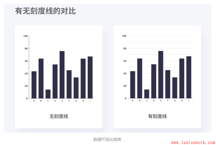 如果你的聽眾只需要了解A數(shù)據(jù)大于B數(shù)據(jù),那么刻度線是沒有必要的,只需在坐標(biāo)軸上使用小刻度即可。如果你的讀者要花一些時(shí)間在柱狀圖上并感興趣A數(shù)據(jù)是45.65而B數(shù)據(jù)是37.66,那么使用刻度線將有助于他們理解。