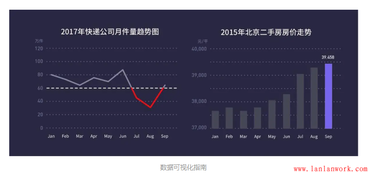 如上左圖,通過添加輔助線和標(biāo)紅的方式,來顯示快遞公司未達(dá)到60萬件派件標(biāo)準(zhǔn)的月份,從而突出顯示公司業(yè)績(jī)不合格部分。如上右圖,通過對(duì)9月份的顏色區(qū)分,來突出顯示二手房?jī)r(jià)格在9月份達(dá)到前所未有的高度。
