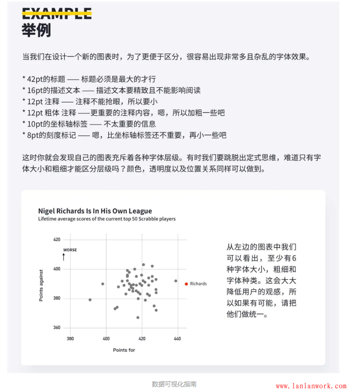 圖表中的字體數(shù)量以及字體大小的種類加起來不要超過3種(標(biāo)題和副標(biāo)題除外)。通常來說,我們?cè)谥谱鲿r(shí)會(huì)把注釋和坐標(biāo)軸標(biāo)簽設(shè)置為兩種字體樣式,所以只需要確保將這兩者統(tǒng)一起來,那么就可以保證我們的圖表不超過3種字體樣式。