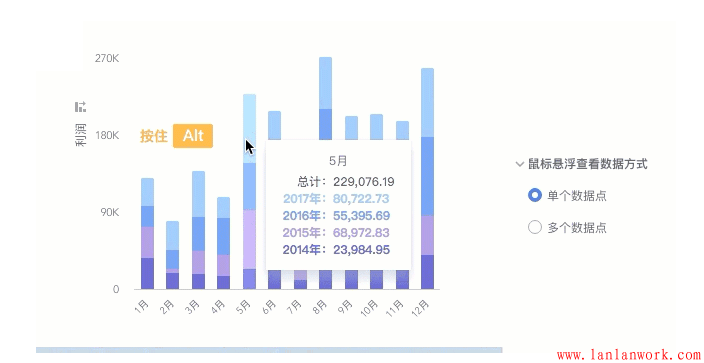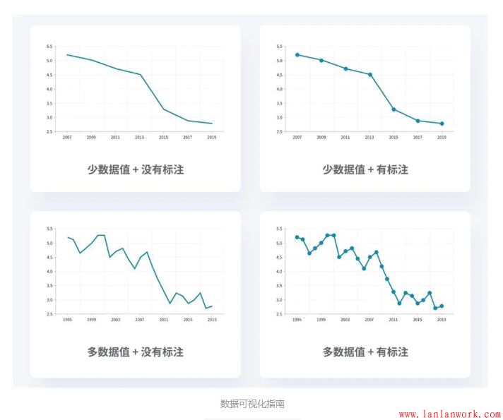 當(dāng)有些特定的數(shù)值特別重要時(shí),我們可以在線條上標(biāo)注出他們,如果你有大量的數(shù)據(jù)需要展示,或者你只想展示數(shù)據(jù)的走勢(shì),那么其實(shí)你只需要使用折線就足夠了,不需要增加數(shù)據(jù)點(diǎn)。不信你可以試試,大量的數(shù)據(jù)點(diǎn) = 混亂不堪的界面。