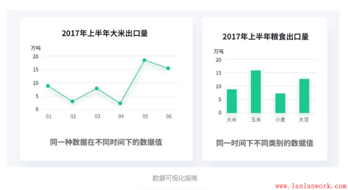 2017年1月和2月的大米出口量是相關(guān)的,他們代表一種數(shù)據(jù)在不同時(shí)間下的數(shù)據(jù)值,因此我們可以用折線圖將它們連接起來。但是2017年1月的大米出口量和玉米出口量(16萬噸)是不相關(guān)的,所以我們不能隨便用折線圖來代替柱狀圖。