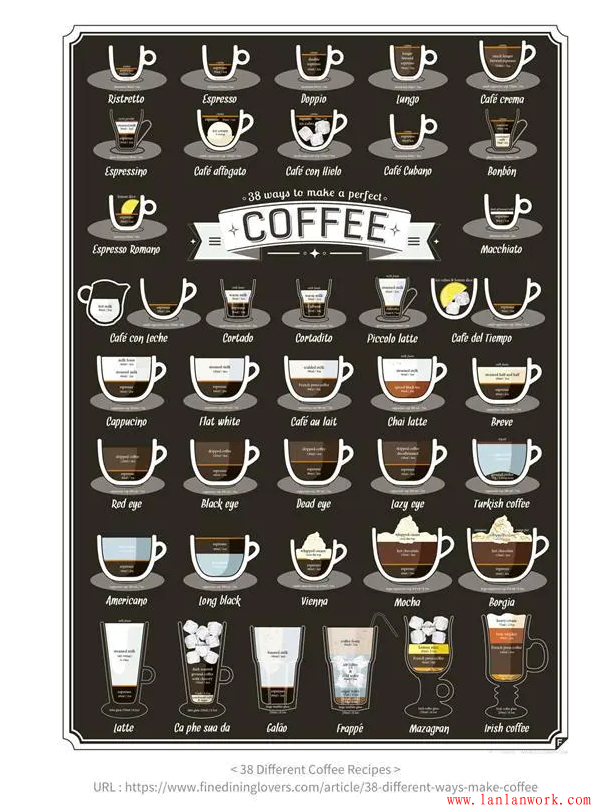 文字有時(shí)候是一種匱乏的信息傳遞方式,而可視化的方式,則是人類最本源的一種信息傳遞方式,圖解就是將很多無法準(zhǔn)確或用語(yǔ)言傳達(dá)的內(nèi)容,以生動(dòng)形象的圖形解釋出來。下圖是一張經(jīng)典的對(duì)于咖啡種類圖解,38種咖啡配方,不必要用多余的文字解釋,直接用圖解表示,簡(jiǎn)單明了,清晰易懂。