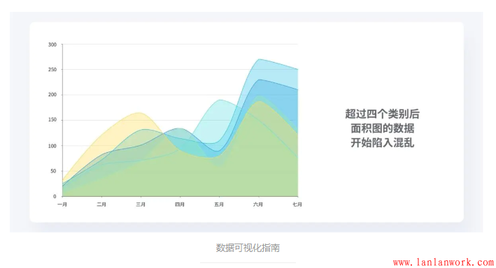 面積圖只適合展現(xiàn)少量的數(shù)據(jù),最多建議不要超過四個(gè)類別,否則就會(huì)導(dǎo)致非常難以識(shí)別。因此在多個(gè)類別下,要盡量避免使用面積圖。