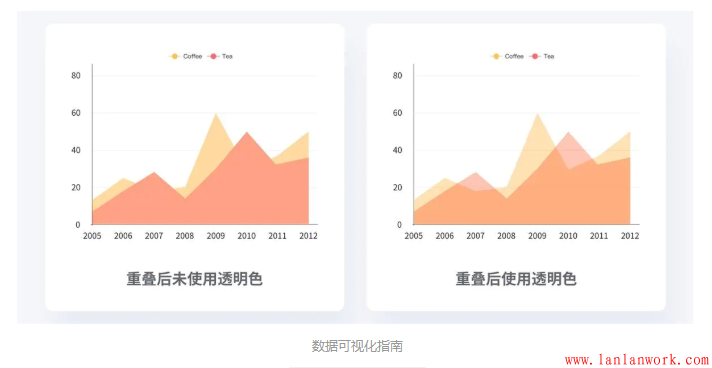 當(dāng)圖表中要展示多組數(shù)據(jù)時(shí),最好保證所有的數(shù)據(jù)都不重疊,這樣才可以更好的展示數(shù)據(jù)。如果無法避免重疊,則應(yīng)該適當(dāng)?shù)脑O(shè)置顏色和透明度,使得重疊的區(qū)域變得更加易讀。