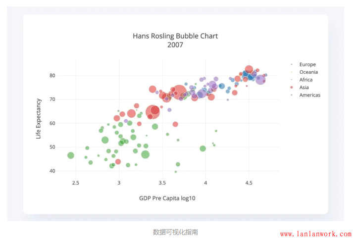 當(dāng)包含多重變量時(shí),散點(diǎn)圖本身包含2個(gè)維度的數(shù)據(jù),當(dāng)出現(xiàn)更多維度時(shí),我們可以通過改變散點(diǎn)的顏色和大小甚至是形狀來對(duì)數(shù)據(jù)進(jìn)行更多維度的劃分,這個(gè)時(shí)候,散點(diǎn)圖即變成了氣泡圖。