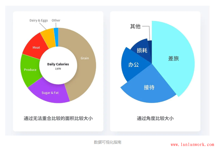 例如上面左圖,我們很難去比較每日從肉類(Meat)中攝入的卡路里與從糖類(Sugar&Fat)中攝入的卡路里數(shù)量的比例。人眼的直覺中,糖類與肉類的比例應(yīng)該在2:1左右,但實(shí)際的比例卻是1.5:1。